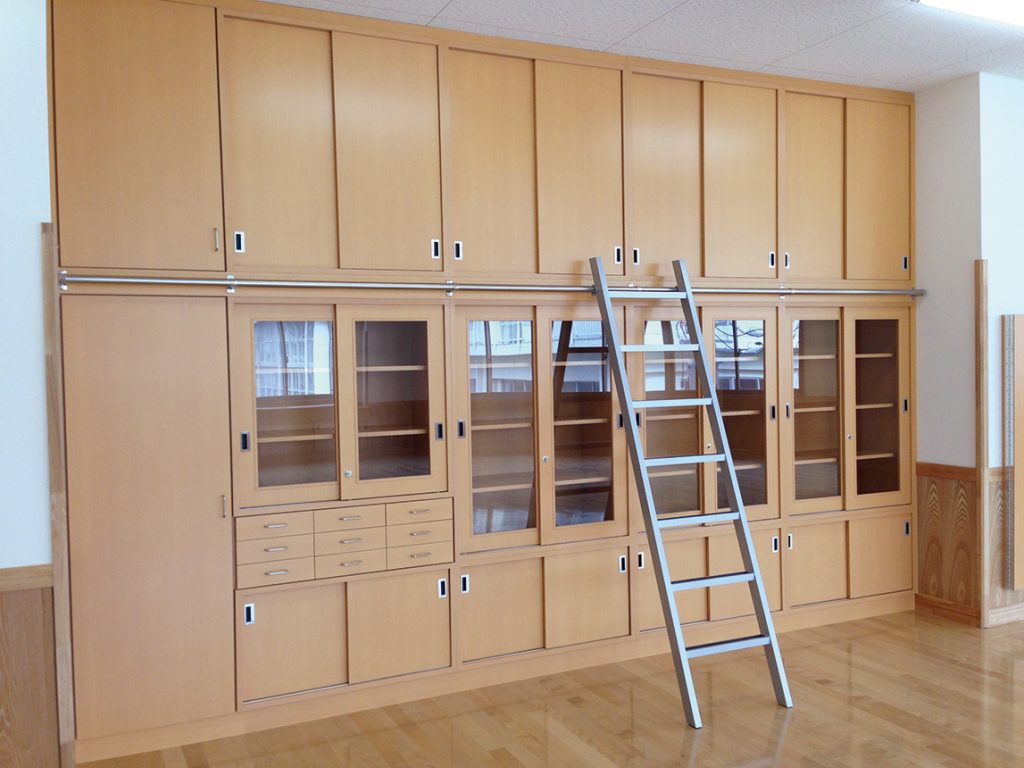 高等学校の教室に納品させていただいた収納棚です。どちらの棚も高い位置にある棚には梯子を使って出し入れできるよう、金属のバーに梯子を引っかけて使用する設計となっており、安全面にも配慮しています。教材の収納や整理整頓に、ご活用いただいています。上記の白い棚は理科室に設置させていただきました。