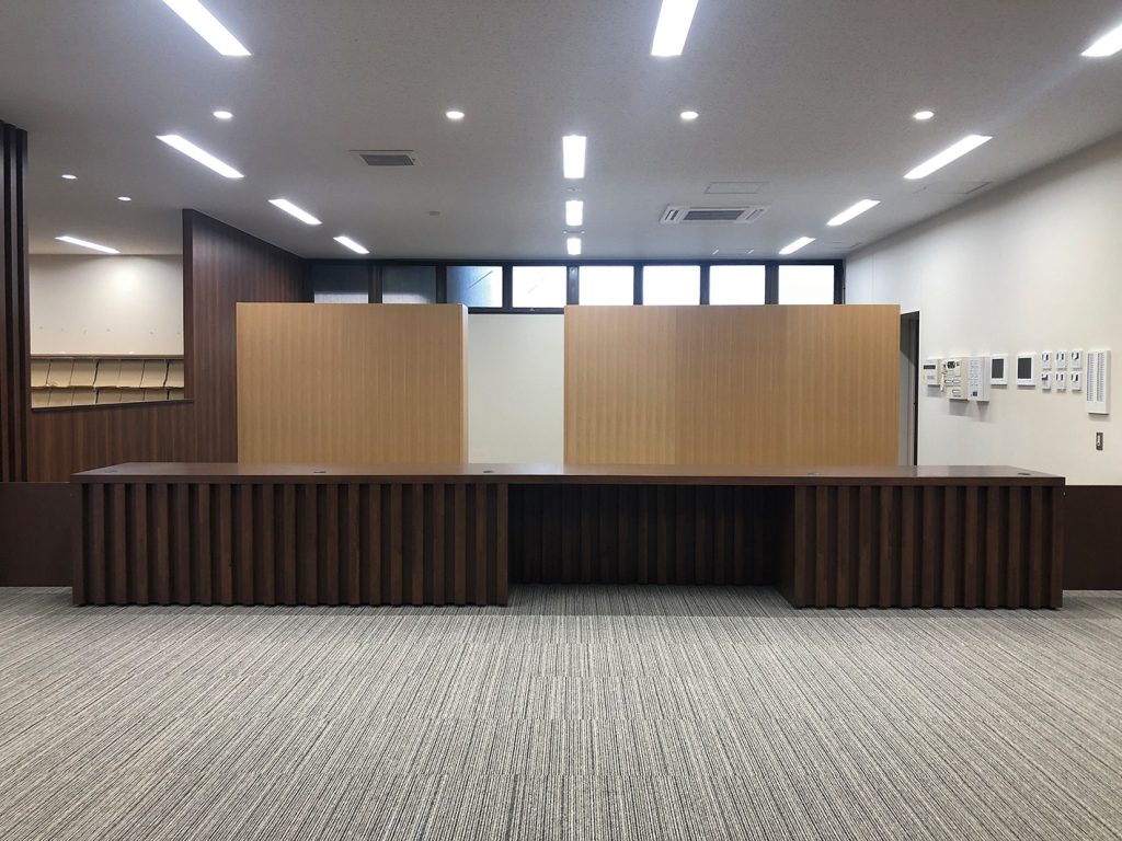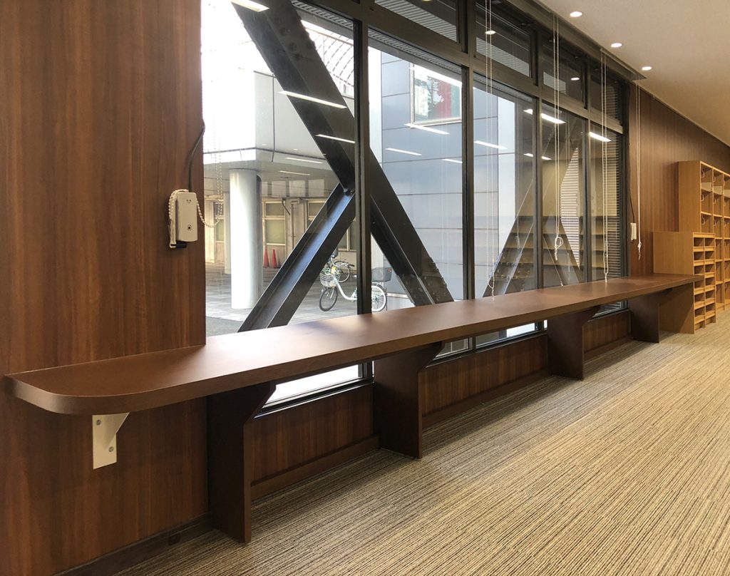 市立図書館をはじめ、地域交流スペースや会議・学習に対応した設備が整う、駅に隣接した公共複合施設に、書架やカウンターなどの図書館家具をはじめ、交流スペースのカウンターテーブルなどを製作させていただきました。