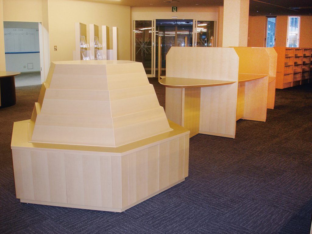 図書館・学習室・多目的交流ホール・展示ギャラリーを備える複合学習施設の図書館に、図書館家具一式を納品いたしました。こちらの書架や展示架のデザインには、地域のシンボルがモチーフとして取り入れられており、既製品では表現が難しい、特注家具ならではの仕事となりました。地域の方々に愛着を持って使っていただけるようなオリジナリティ溢れる空間です。